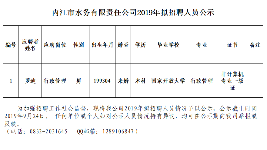 內(nèi)江市水務(wù)有限責(zé)任公司2019年擬招聘人員公示