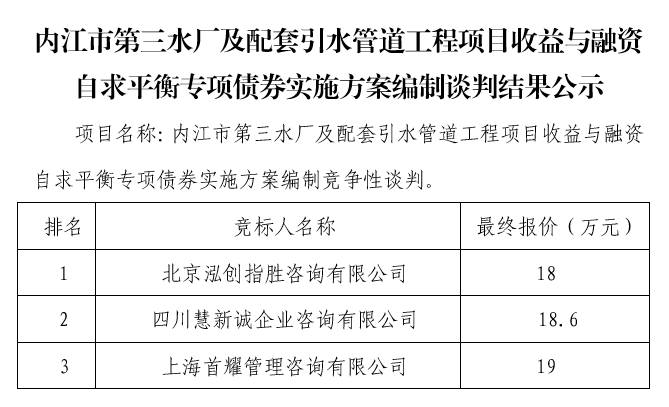 內(nèi)江市第三水廠及配套引水管道工程項目收益與融資自求平衡專項債券實施方案編制談判結果公示