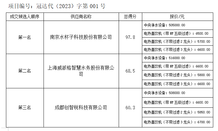 內(nèi)江市水務(wù)有限責(zé)任公司內(nèi)江高級技工學(xué)校管道直飲水成套設(shè)備及附件采購(含安裝)項目競爭性磋商結(jié)果公示