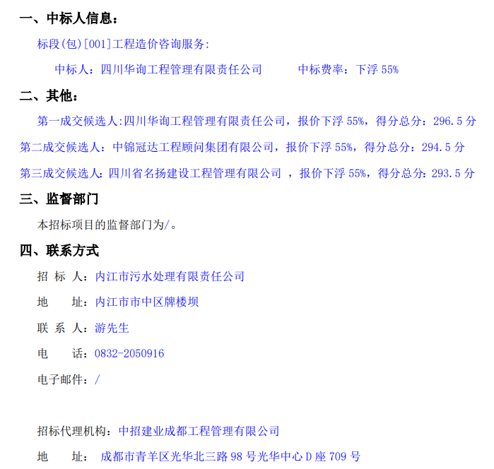 內(nèi)江市第二污水處理廠二期工程造價(jià)咨詢服務(wù)項(xiàng)目中標(biāo)結(jié)果公示