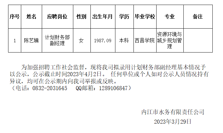內(nèi)江市水務(wù)有限責(zé)任公司擬錄用計(jì)劃財務(wù)部副經(jīng)理公示