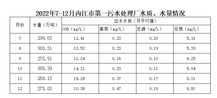 內(nèi)江市污水處理有限責任公司第一污水處理廠2022年7-12月水量、水質(zhì)情況