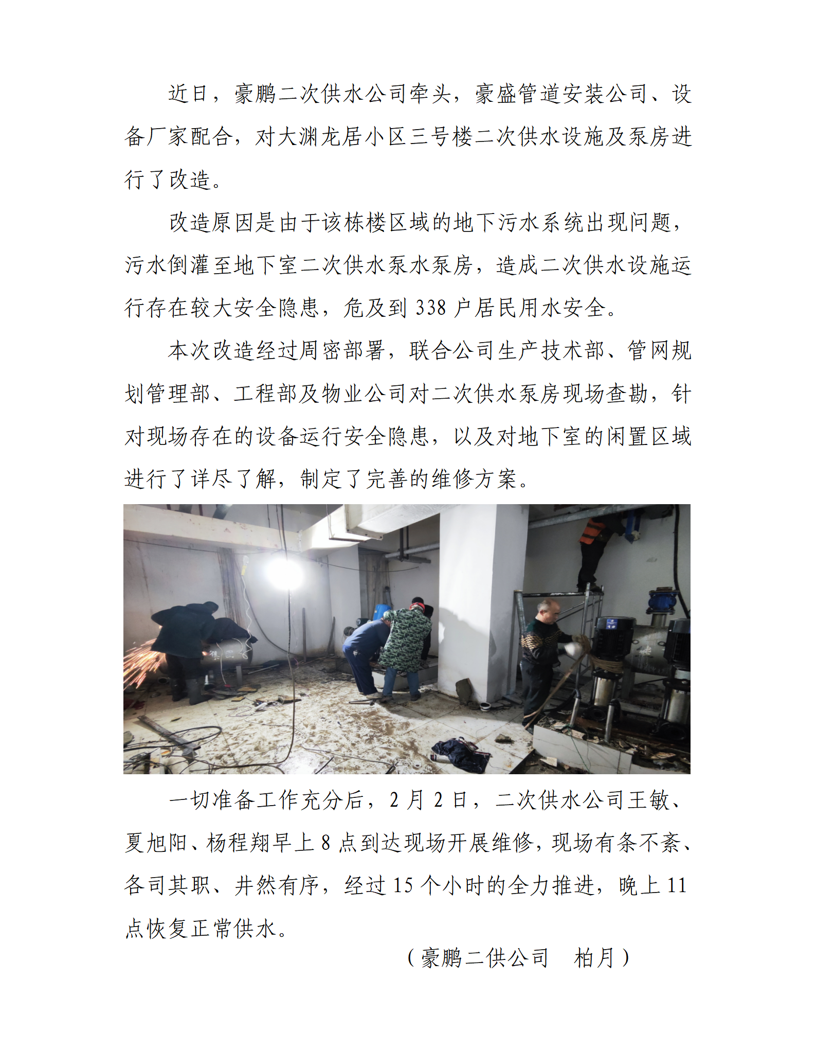 豪鵬公司牽頭對大淵龍居小區(qū)二次供水設(shè)施及泵房進(jìn)行改造