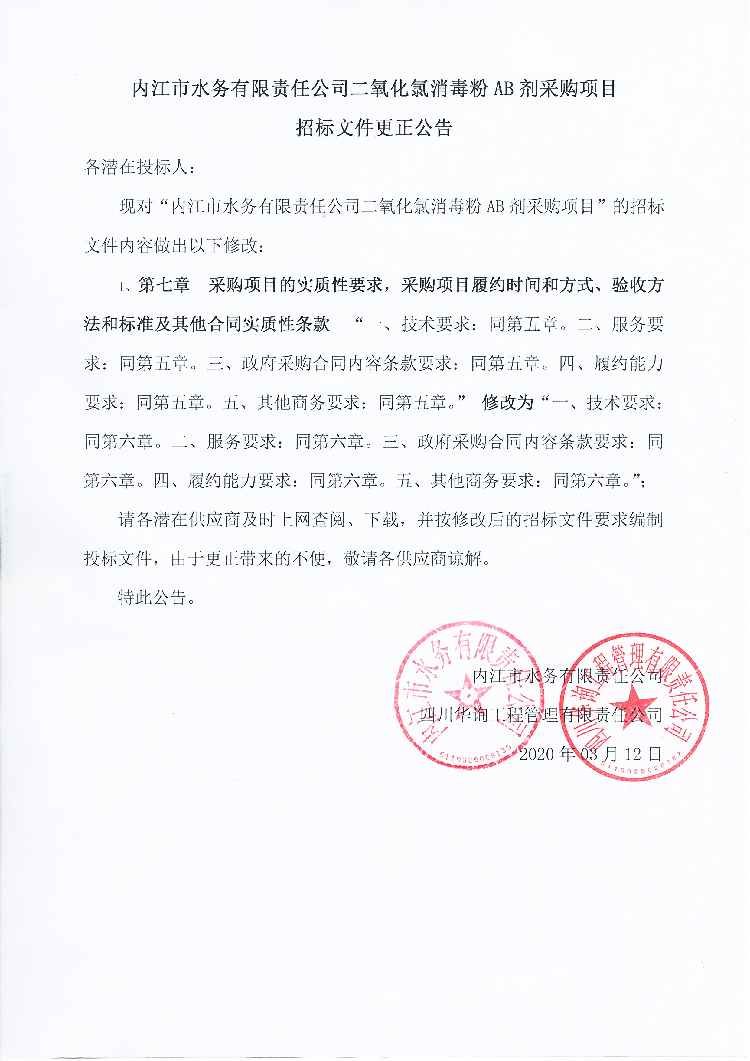 內(nèi)江市水務(wù)有限責任公司二氧化氯消毒粉AB劑采購項目招標文件更正公告