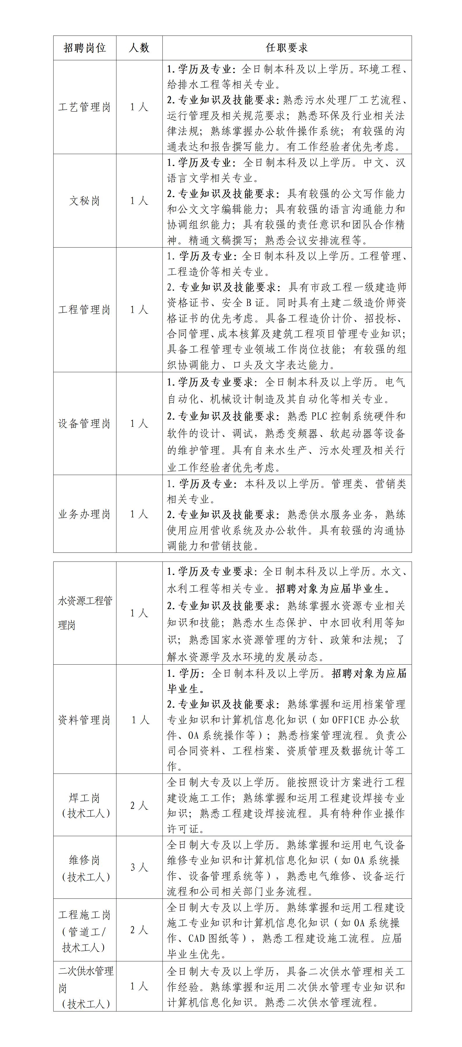 內(nèi)江市水務(wù)有限責(zé)任公司系內(nèi)江市國資委所屬內(nèi)江投資控股集團(tuán)有限公司的全資子公司。是集城市供水、污水處理、供排水工程設(shè)計(jì)、工程施工為一體的國有獨(dú)資市政公用骨干企業(yè)。為滿足公司高質(zhì)量發(fā)展對人才的需求,特面向社會(huì)公開招聘相關(guān)人員?,F(xiàn)將招聘事項(xiàng)公告如下。
