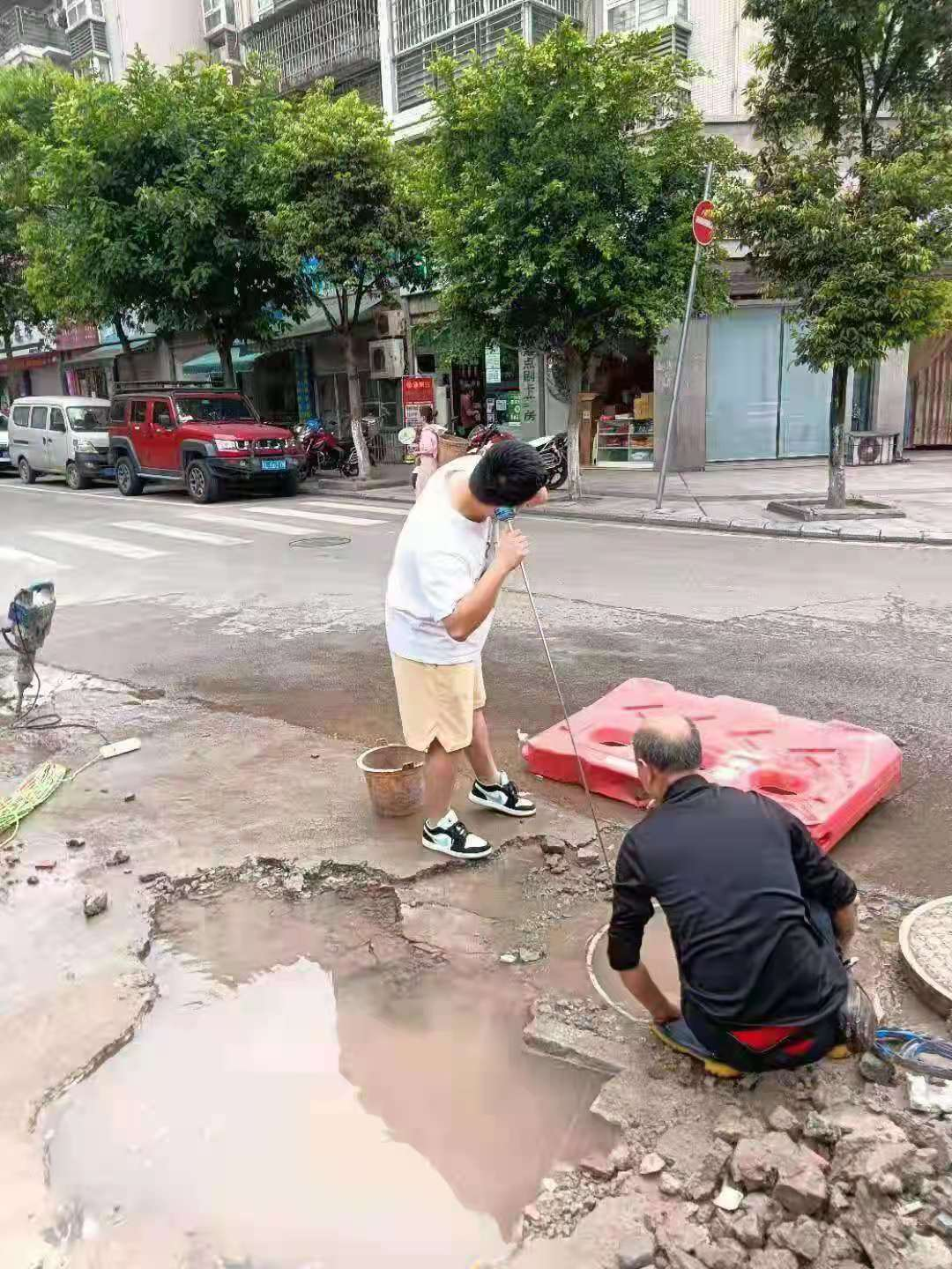 7月31日,市水務(wù)公司管網(wǎng)規(guī)劃管理部接到鄉(xiāng)鎮(zhèn)供水部電話,白馬共和街出現(xiàn)大面積漏水情況。探漏人員立即趕赴現(xiàn)場,巡查漏點。在經(jīng)過反復(fù)的探測后,查明漏水原因為PE110供水主管破裂所致。鄉(xiāng)鎮(zhèn)供水部及時對漏點進行修復(fù),恢復(fù)了供水。