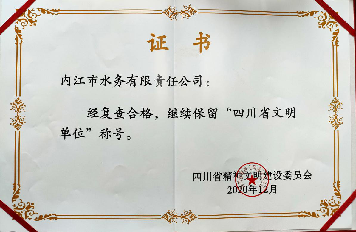 近年來,市水務(wù)公司黨委始終以*新時(shí)代中國(guó)特色社會(huì)主義思想為指導(dǎo),推進(jìn)精神文明建設(shè)工作不松勁,抓好生產(chǎn)經(jīng)營(yíng)工作促發(fā)展,推動(dòng)公司精神文明和物質(zhì)文明建設(shè)的雙豐收。根據(jù)四川省精神文明建設(shè)委員會(huì)《關(guān)于復(fù)查確認(rèn)繼續(xù)保留稱號(hào)的四川省文明城市、文明村鎮(zhèn)、文明單位、文明家庭、文明校園的通報(bào)》(川文明委〔2020〕20號(hào)),內(nèi)江市水務(wù)有限責(zé)任公司順利通過復(fù)查,繼續(xù)保留“四川省文明單位”榮譽(yù)稱號(hào)。
